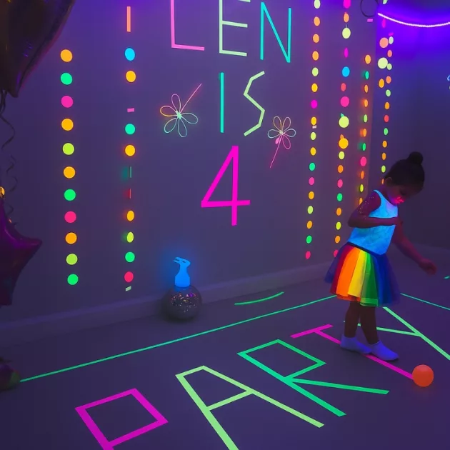 I made a glowing trail to the snack table for game night. The tape is sturdy and everyone loved following the neon path.
