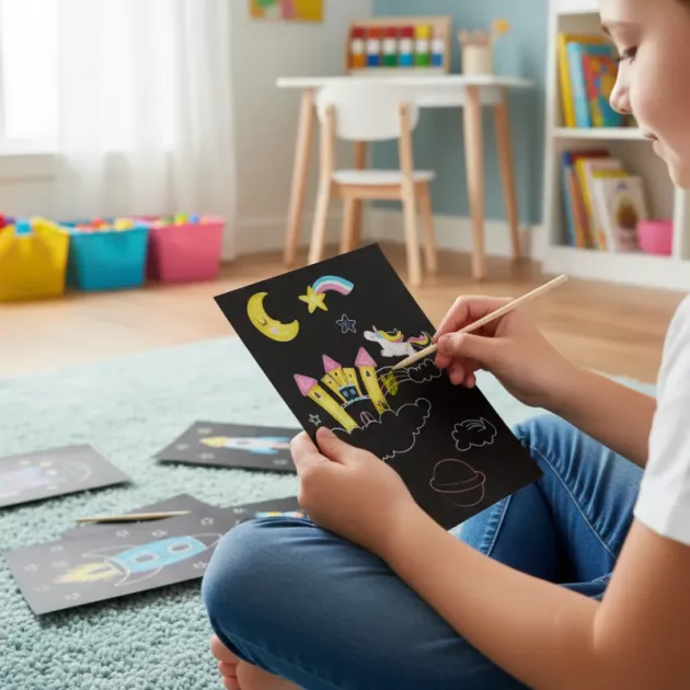 Watch creativity flourish as each sheet reveals bright colours. Magical designs appear with every scratch, keeping children engaged. Beautiful glow effects turn every artwork into a unique masterpiece.