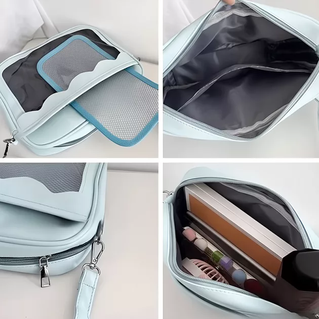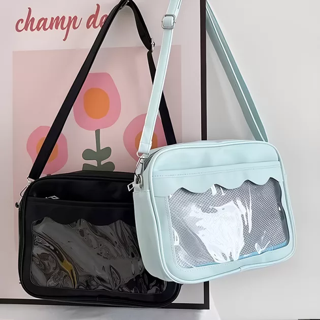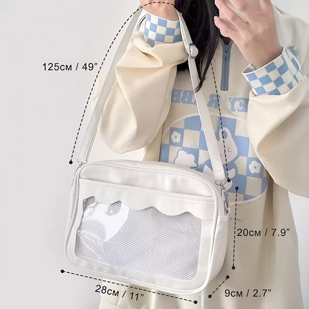 It’s my favorite bag ever! Carries all my stuff and looks cute. The clear spot in front is my favorite part.