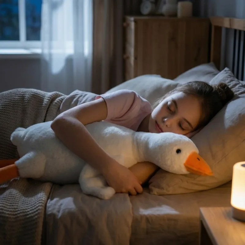 My son loves hugging this goose at bedtime. The bright color really makes his room look fun, and he sleeps more peacefully with it.