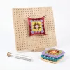 I got this crochet board for rainy afternoons, and my daughter now asks for yarn time instead of TV. Her little squares look so tidy.