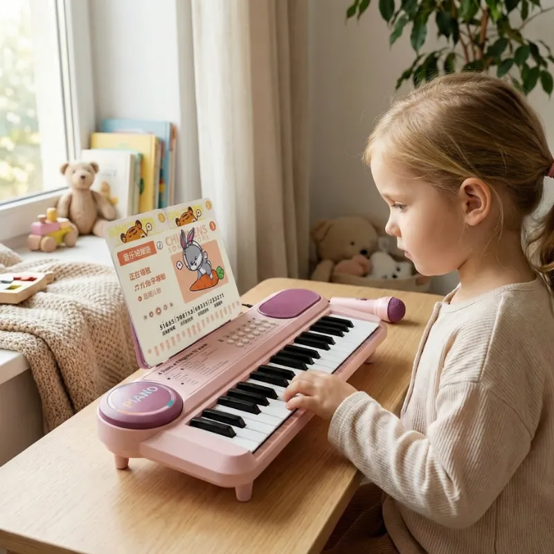 My son presses every key and makes up silly songs before bed. The simple song sheets help him recognize notes without getting frustrated.